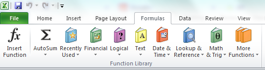 Excel provides a whole host of formulas that you can use to perform all sorts of calculations and other manipulations. In general, each formula is written as =FORMULA(argument1,argument2,argument3,…). Each of those arguments is specific to the formula you are using, and Excel will help you find out what you need in those fields. You can find the full list of formulas in the Function Library on the Formula Ribbon (Figure 3).