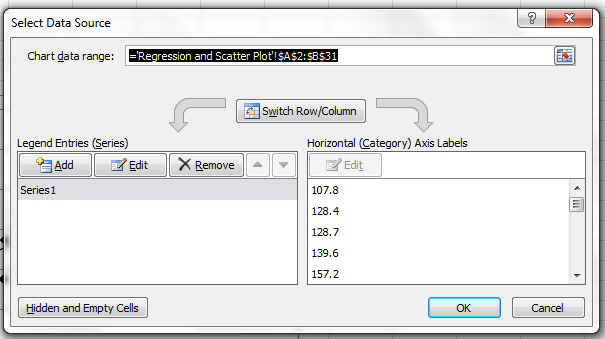 The most important button in the Design tab is the Select Data button. That allows you to tell Excel exactly what data you’re using for the chart. Once you have clicked it, you will be able to add and edit data series (Figure 6). Data series are related data points (i.e., the pH of each individual in your control sample.) If you click the Add or Edit button, you can select the data for the series, as well as name the series.