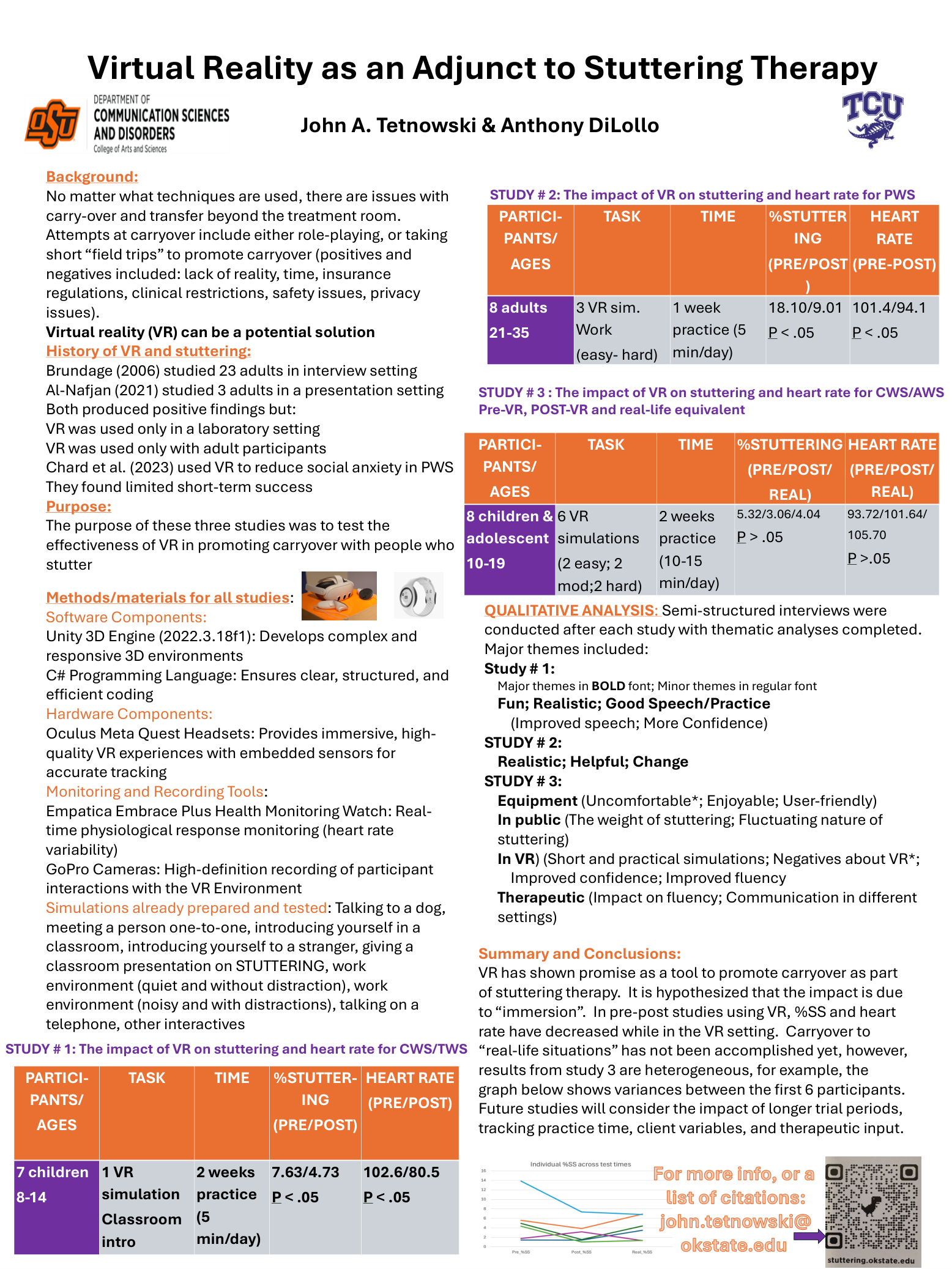 - Oxford Stuttering and Cluttering Research Conference Paper (Tetnowski & DiLollo 2025)This study, by Dr. John Tetnowski and Dr. Anthony DiLollo, investigated whether virtual reality (VR) could effectively promote carryover of fluent speech beyond the therapy setting for people who stutter. Using immersive VR simulations across children, adolescents, and adults, the researchers found significant reductions in stuttering frequency and heart rate, suggesting that VR may strengthen real-world communication confidence and fluency.